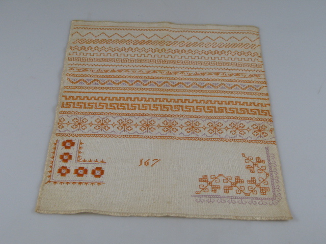 Tussen de werkjes die Grietje gemaakt heeft, bevindt zich een stekenlap. De doek die 33 x 27 cm meet is gevuld met allerlei sierrandjes, die onder de noemer Holbeinsteek vallen.