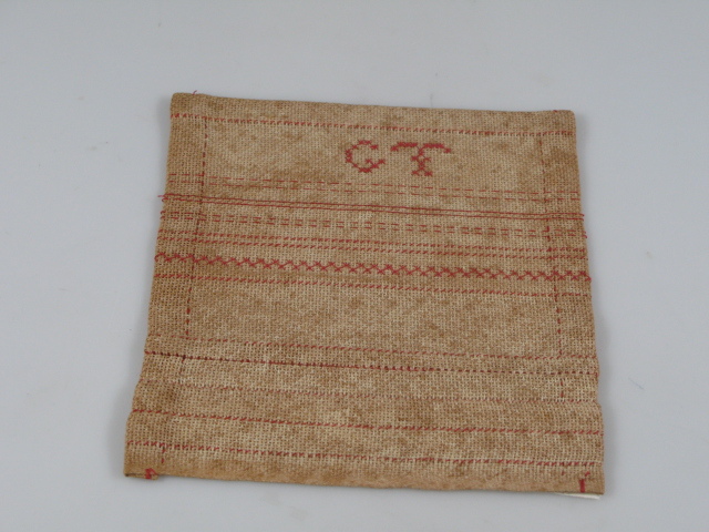 Deze doek, één van deze twee steken- en nadenlappen, bestaat uit reepjes stof, die met plat- en stiksteekjes onzichtbaar aan elkaar gezet zijn. In het handwerkonderwijs worden jonge meisjes in de nuttige en in fraaie handwerken onderricht. Steken- en nadenlappen maken deel uit van de eerste categorie. Op deze doekjes worden verschillende technieken geoefend zoals het maken van kantjes en al dan niet opengewerkte sierranden, het aan elkaar zetten van losse strookjes stof en soms ook het maken van knoopsgaten. De stroken worden benut om alfabetten en cijferreeksen te oefenen. Grietje is niet verder gekomen dat het met rode steekjes vastzetten van de stroken. Aan de bovenzijde plaatst ze haar initialen. Dit doekje dat 19,5 x 17,5 centimeter meet is evenals zijn ‘zusje’, klein van afmeting gebleven. Er wachtte nog meer stop- en borduurwerk op Grietje.