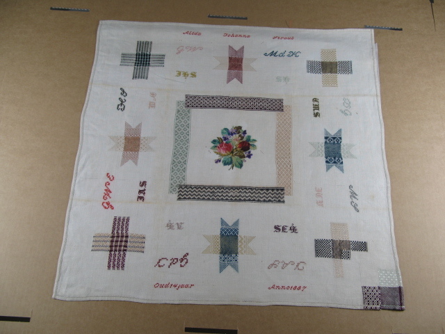 opschrift tegen de onderrand: Oud14jaar / Anno 1887: leeftijd van borduurster, jaar voltooiing doek