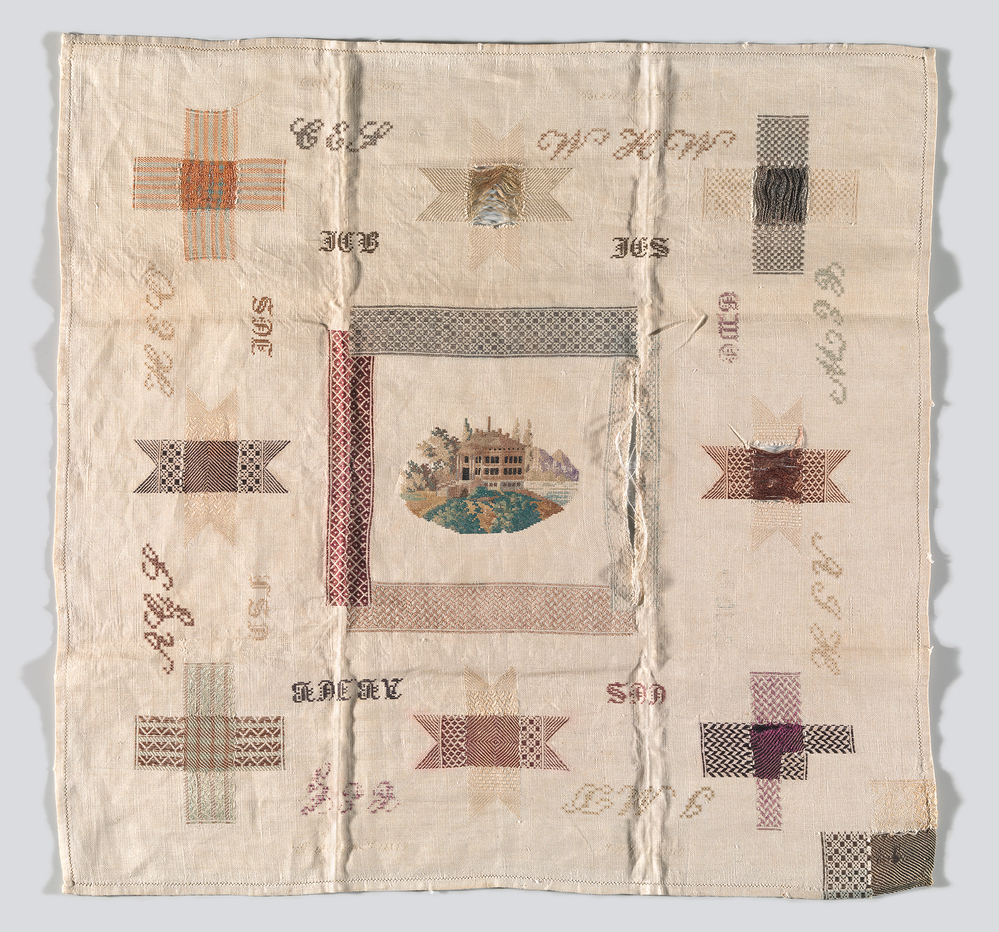 Catharina Bovenkerk wordt op 1 april 1868 in Amsterdam geboren. Ze is de dochter van Jacob Cornelis Bovenkerk (1842-1883) en Johanna (Janna) Elisabeth Scheffer (1848-1872) Catharina is het oudste kind; na haar wordt nog een jongen, Jacob Cornelis, geboren. Haar ouders overlijden op jonge leeftijd. Catharina wordt liefdevol opgenomen in het Burgerweeshuis in Amsterdam. Enkele jaren later, op 6 februari 1890 treedt ze in het huwelijk met Hendrikus Marius Steuven (1863-1936), een stukadoor uit Amsterdam. Uit dit huwelijk wordt in 1890 zoon Gerard Diederik geboren. Lang duurt het huwelijksgeluk niet, op 8 juli 1893 overlijdt ze volgens haar rouwadvertentie na een langdurig en smartelijk lijden op 25-jarige leeftijd, een echtgenoot en peutertje achterlatend. Catharina’s stoplap voldoet aan alle kenmerken van een Burgerweeshuisstoplap. Rondom een middenkader waarin een geromantiseerd motief is aangebracht – in dit geval een uit huis in een bergachtig landschap - worden acht stoppen geoefend, altererend drie kruisstoppen en vier sterstoppen afgesloten met een kruisvormige hoekstop in de rechteronderhoek. Deze stop heeft een hogere moeilijkheidsgraad. Twee van de vier stroken, die samen het middenkader vormen, bestaan uit sneestoppen. De initialen tussen de stoppen verwijzen naar personeel van het weeshuis, familie en soms vriendinnetjes. De leesrichting draait met de klok mee. Aan de bovenzijde en onderzijde zijn nog vaag de resten van haar naam, haar leeftijd en het jaar van voltooiing van de doek te zien. Op grond van de leeftijd van borduurster en vergelijkbare en gedateerde burgerweeshuisdoeken, zou de doek rond 1883 vervaardigd kunnen zijn. De doek meet 52,5 x 54 cm. Het meisje koos voor zijden borduurgarens op een linnen ondergrond. Naast stop- en doorstoptechnieken maakte ze gebruik van kruissteek en de dubbele stersteek. De doek is gehavend. Sommige stoppen zijn verslapt en er zijn gaten in gevallen. Of dit slordig werk of gebruikssporen zijn is niet met zekerheid te zeggen. De doek is waarschijnlijk opgevouwen bewaard gebleven en heeft daar aanzienlijke schade door opgelopen. De merklap die altijd voorafgaat aan het borduren van een stoplap, is mogelijk verloren gegaan. Het museum heeft twee merklappen (KA 17301 en KA 17302) van Catharina’s tante Catharina Engelina Scheffer (1861) uit een andere schenking in de collectie. (Suzette van 't Hof)