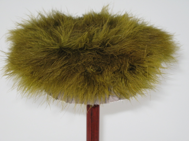 Olijfgroene zwanenveren, gezet op een ondergrond van zwart tarlatan. Gevoerd.
