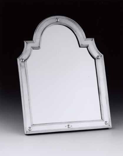Rechthoekige spiegellijst met ingezwenkte toogvormige bovenzijde. Gladde lijst met geprofileerde randen en zes siernoppen ter afdekking van schroeven. Achterzijde met scharnierende uitzetsteun van notenhout. Lijst gemonteerd met spiegelglas.