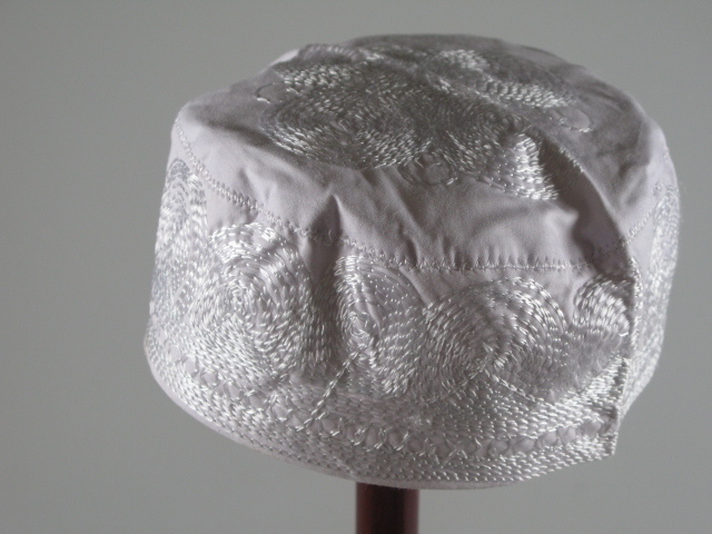 Wit-katoenen muts; applicaties in wit glansgaren. (Vooral gebruikt door islamitische mannen bij het gebed).- Trefwoorden