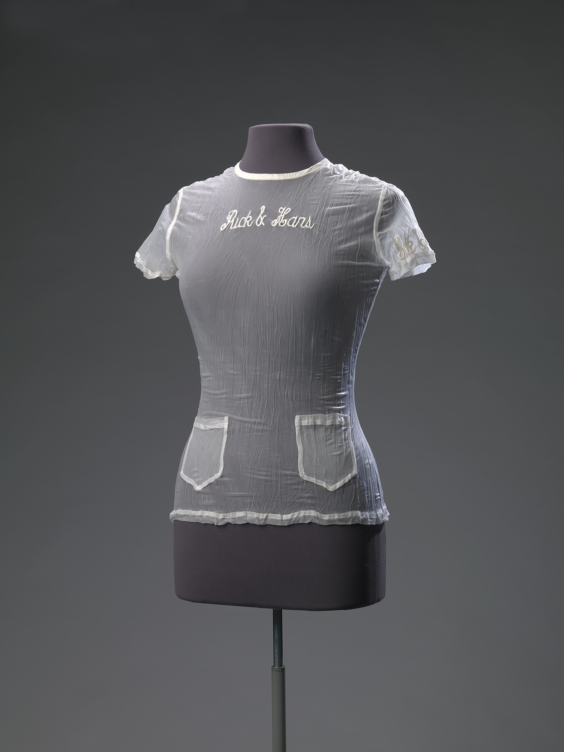 Dit t-shirt met de naam 'CAMELIA' is vervaardigd door het Amsterdamse modelabel Puck & Hans, opgericht door modeontwerpersechtpaar Puck Kroon (1941) en Hans Kemmink (1947). In 1967 openden Puck & Hans hun eerste winkel in Den Haag. Vanaf 1974 hadden ze ook een boetiek aan het Rokin te Amsterdam, met exclusieve en praktische kleding in moderne, eigenzinnige stoffen. De stijlvolle etalage aan het Rokin was voor voorbijgangers altijd een lust voor het oog. Begin 1998 is de winkel gesloten. ( Sarah Remmerts de Vries)