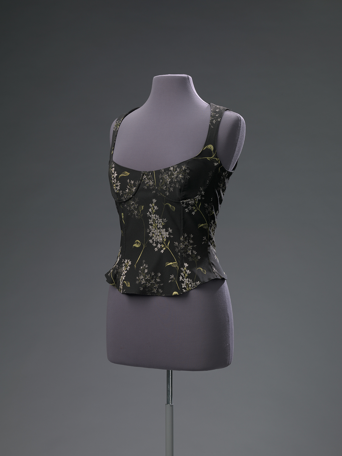 Top, genaamd "DIANA", van zwart mengweefsel van polyamide, katoen en elastaan met ingeweven bloem- en bladmotief in groen, grijs en wit. Cups verstevigd met beugels. De in vorm geknipte schouderbanden vormen één geheel met de beugel-BH. De top heeft een klein schootje en in de verticale voor- en achternaden baleinen. Sluiting middenachter middels een deelbare zwarte kunststof rits. Het lijfje is geheel gevoerd met een voering van zwarte acetaat met damast motief.