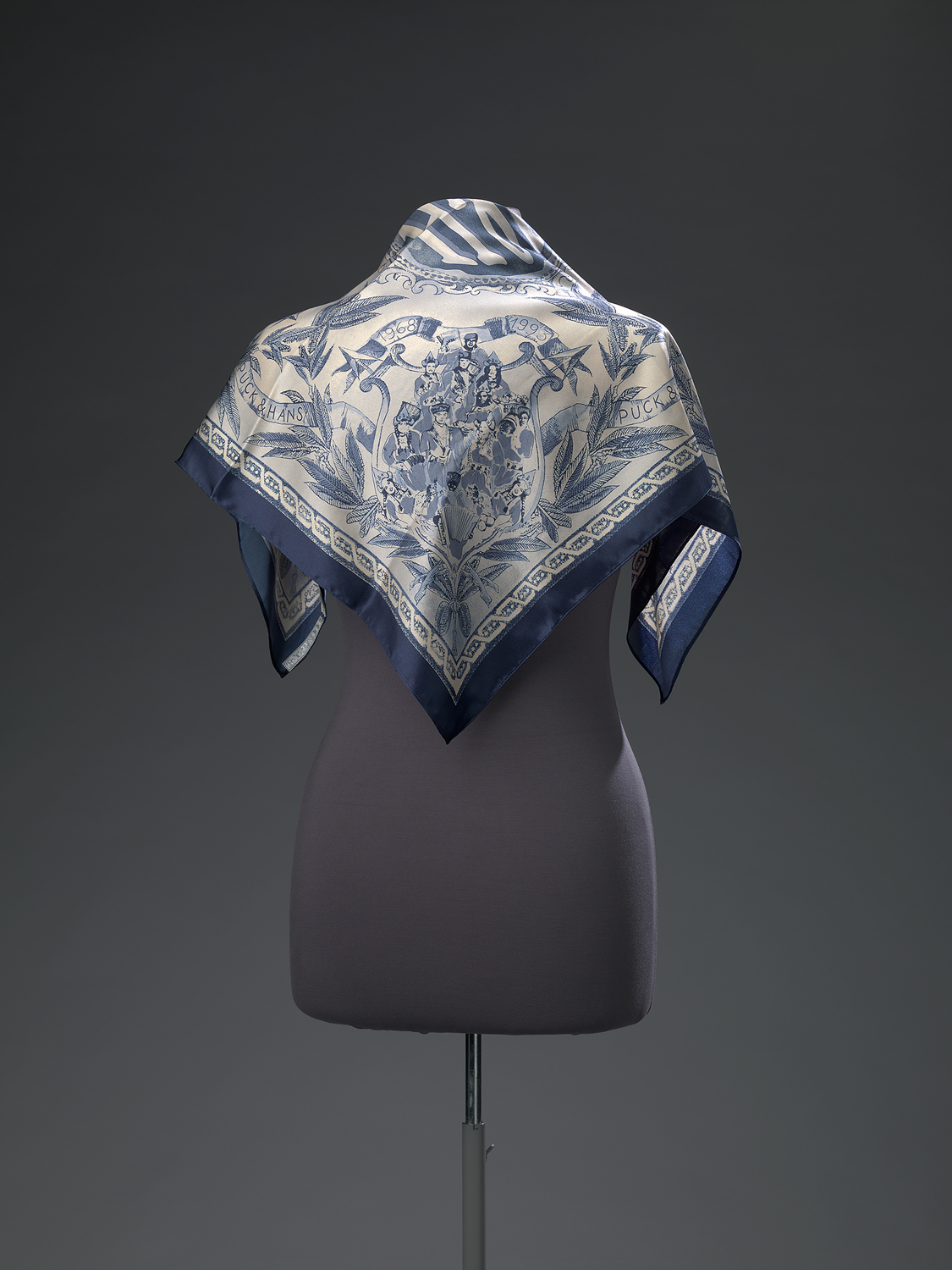 Sjaal, genaamd "JUBILEE", met in het midden een medaillon met daarin, in perspectief, de letters P&H. In de vier hoeken Puck en Hans in Volendams kostuum, omringt door medewerkers. Boven de groep een lint met daarin 1968 1993. Deze linten met opdruk verbinden ook, langs de randen, de vier groepen. De shawl is verder opgevuld met lauriertakken. De kleurstelling is zodanig dat het effect van Delftsblauw verkregen is.