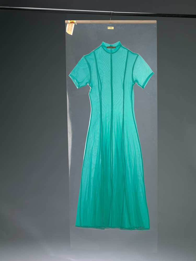 Deze azuurblauwe japon is vervaardigd door het Amsterdamse modelabel Puck & Hans, opgericht door modeontwerpersechtpaar Puck Kroon (1941) en Hans Kemmink (1947). In 1967 openden Puck & Hans hun eerste winkel in Den Haag. Vanaf 1974 hadden ze ook een boetiek aan het Rokin te Amsterdam, met exclusieve en praktische kleding in moderne, eigenzinnige stoffen. De stijlvolle etalage aan het Rokin was voor voorbijgangers altijd een lust voor het oog. Begin 1998 is de winkel gesloten. ( Sarah Remmerts de Vries)