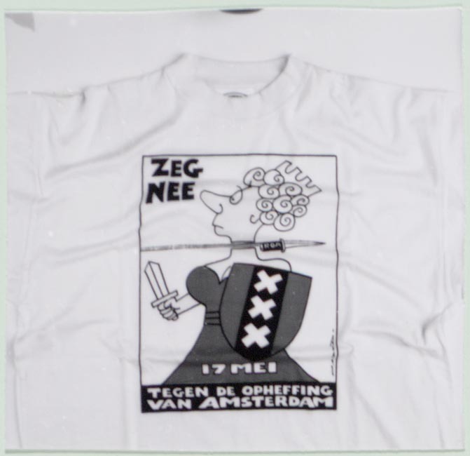 Wit T-shirt. Middenvoor, binnen rechthoekig kader, een gestileerde voorstelling van de Amsterdamse Stedemaagd in de kleuren rood en zwart. Het hoofd wordt door een voorbij vliegende dolk van de romp gescheiden. OP het heft de letters: /ROA/. In zwart en witte letters de tekst: ZEG NEE/ 17 MEI/ TEGEN DE OPHEFFING VAN AMSTERDAM