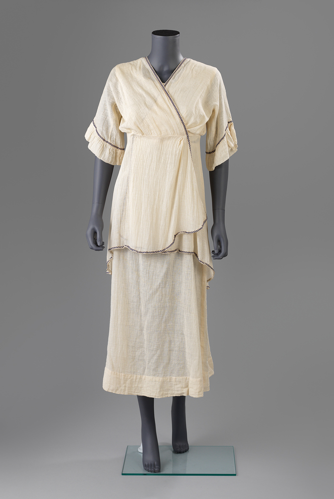 Vanaf de late negentiende eeuw tot aan het uitbreken van de Eerste Wereldoorlog in 1914 beleeft de rijke Europese bovenlaag jaren van overdaad en pracht en praal: "La belle Epoque". Tegelijkertijd begint de oude maatschappelijke orde te wankelen. De emancipatie van de vrouw neemt gaandeweg toe. In 1910 treedt in Parijs de Russische balletgroep van Sergei Diaghilew (1872-1929) op. De felgekleurde oosterse kostuums - ontworpen door Leon Bakst (1866-1924) - vormen het onderwerp van gesprek. Voor een van de meest geruchtmakende ontwerpers van die tijd, Paul Poiret (1879-1944), vormen ze een nieuwe inspiratiebron. Hij opent in 1906 zijn eigen modehuis in Parijs. Met zijn ontwerpen van tunieken en kimono's creëert hij een slank en soepel silhouet dat zijn oorsprong al in de Reformkleding heeft. Door Poiret wordt het tot algemene mode gemaakt. Pas als Frankrijk deze mode accepteert, wordt het ook elders mode. Het korset heeft in deze mode geen plaats. Vanaf deze tijd loopt het aantal vrouwen dat korsetten draagt dan ook snel terug. Poiret ontwerpt de bekende "lampenkaptuniek", een halflange tuniek met daaronder een smalle rok. Zijn ontwerpen zijn buitengewoon populair in Frankrijk en worden vervolgens in andere landen nagevolgd. Zo verschijnen er verschillende variaties op zijn modellen. Een voorbeeld daarvan is deze witte tuniek met rok. Het silhouet is naar onder toe smal, de stof valt soepel om het lichaam. Slechts een eenvoudige garnering zorgt voor versiering. De nieuwe lage V-hals zorgt in het begin voor veel kritiek, maar is sindsdien niet meer weg te denken uit het modebeeld. ( Annemarie den Dekker)
