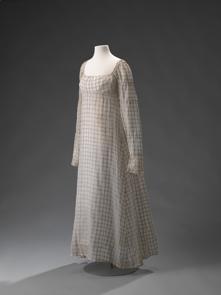 Lichte geruite empire japon, daagse japon met lange mouwen. Ingeweven ruit met wit en donker patroon. De mouwen hebben vier oprijgjes met vulkoord. Vanuit de verhoogde taille valt de japon gerend uit. Sluiting middenachter met koordjes. De voorzijde is in te rimpelen met een koordje. De japon is niet vermaakt.- Trefwoorden