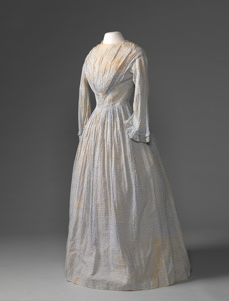 De japon is waarschijnlijk aangepast, in de rok zijn naaisporen, plooien en vouwen te zien. Waarschijnlijk is de japon gedragen door een jong meisje van 10-12 jaar, en was de rok korter en nog net voetvrij. De rok is later langer gemaakt door alle oprijgen eruit te halen. Dit verklaart waarom de rok geen stootband heeft langs de zoom, en nu niet over een crinoline zou passen. Als de rok korter was paste de rok wel over een crinoline.
