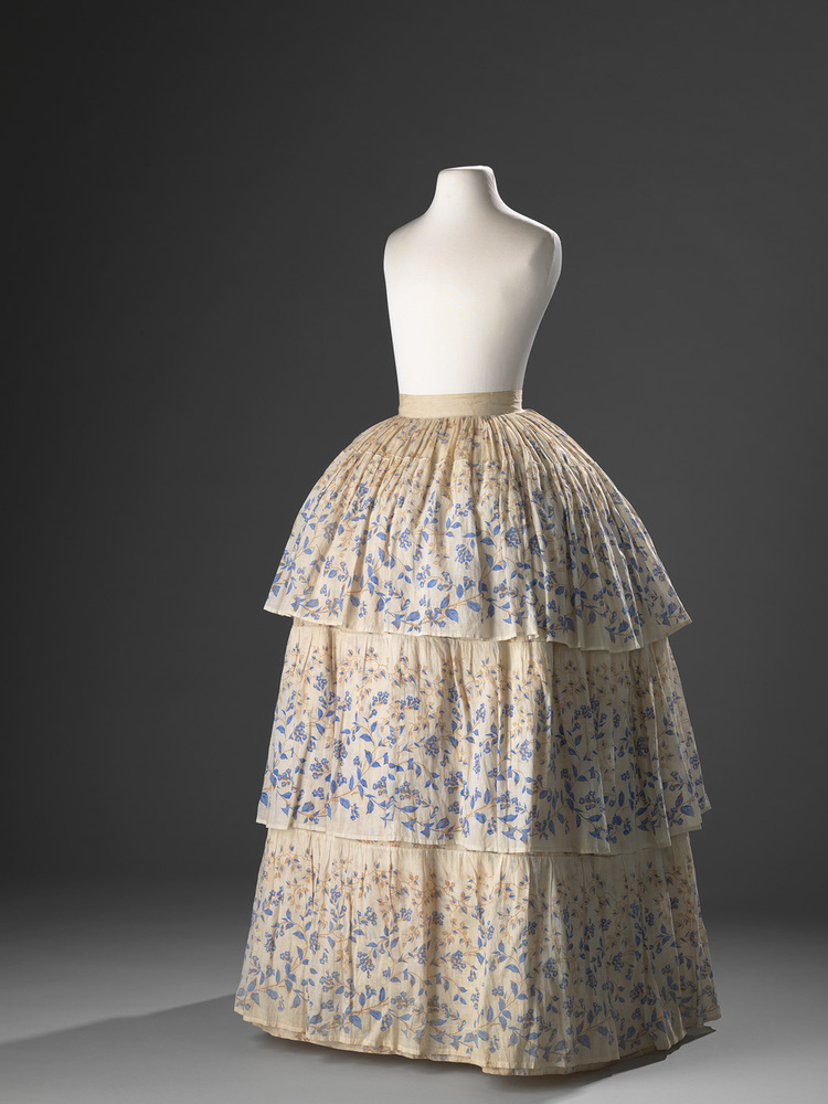 Rok 'a la disposition' van paars gebloemde stof met drie stroken voor een crinoline.