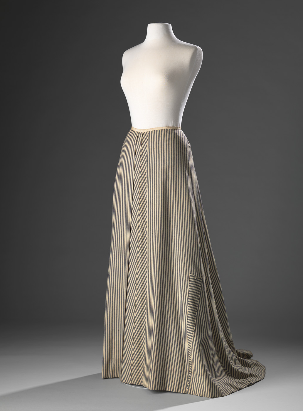 Gestreepte sportieve rok van wol en katoen. De rok past in het modebeeld van tussen 1904 en 1910, door de smalle en strakvallende bovenzijde en de naar onder uitwaaierende rok.