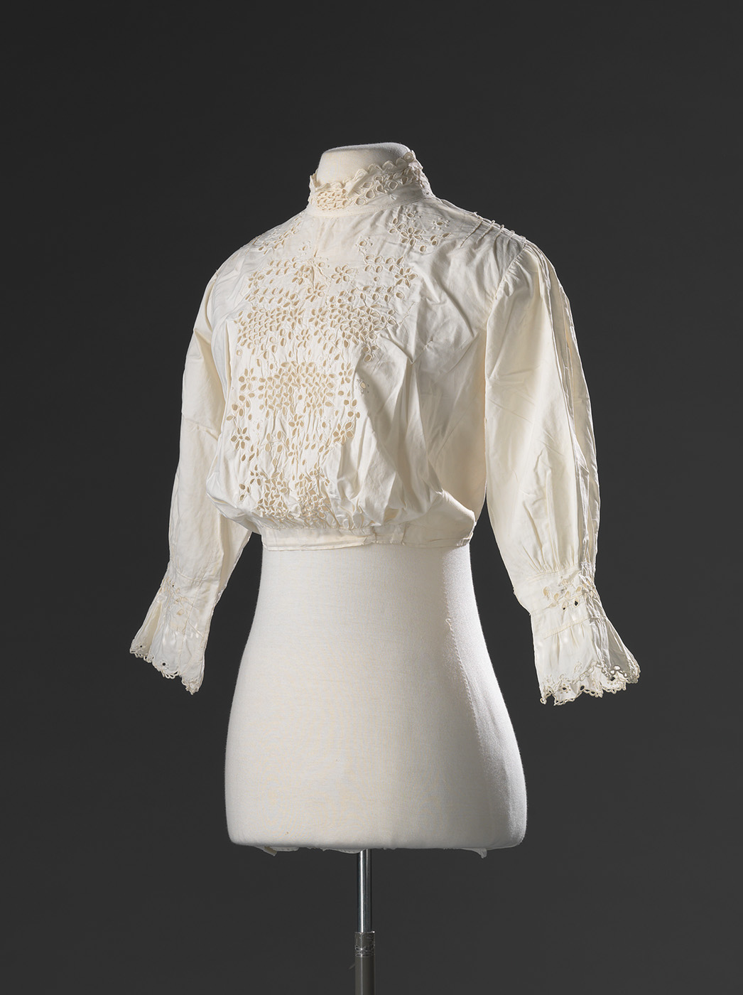 Een witte katoenen blouse als deze werd gedragen als ochtendkleding of als sportieve, informele maar modieuze kleding. De blouse is modieus, alleen de broderie anglaise is ouderwets in deze periode.