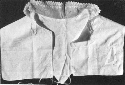 Witte halsdoek of chemisette uit samengestelde delen. Later in elkaar gezet, om te verkleden. Band klopt niet, kraag is er afgescheurd opgezet. Het materiaal is uit de periode 1820-1850. Rood geborduurde initialen: CC.- Trefwoorden