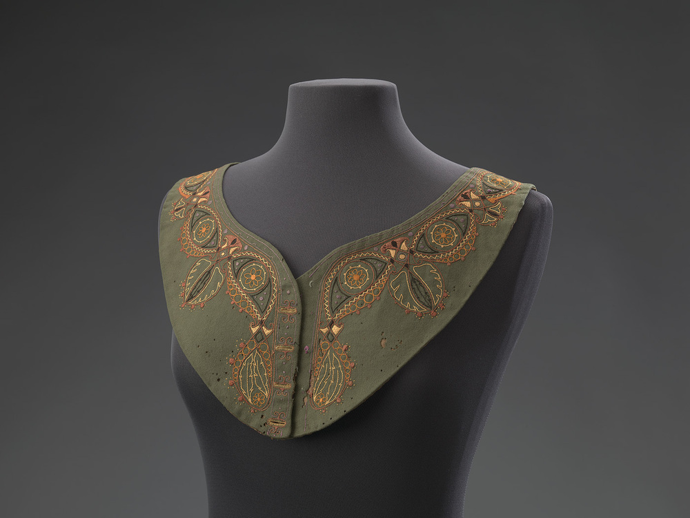 Groene wollen kraag, gebroduurd met Nieuwe Kunst ornamenten in oranje, bruin, zwart en geel. Gevoerd met bruin katoen. Sluiting is met vier knopen aan de voorzijde middenvoor.- Trefwoorden