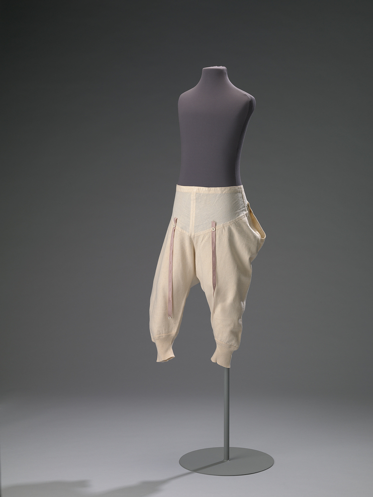Proefmodel van de Vereeniging vakschool voor verbetering van vrouwen- en kinderkleeding. Onderbroek van crèmekleurige geruwd tricot met brede heupband van crèmekleurig katoen. Aan de voorzijde onder aan de heupband twee met stof overtrokken knopen waaraan twee lengtes roze knoopsgaten elastiek. Onderaan de rechter elastiek een parelmoeren knoop (ontbreekt links) ter bevestiging van de kousen. In het kruis een vierkante inzet. Pijpen onderaan afgewerkt met een tricot boord. Klepsluiting aan de achterzijde. De achterpanden zijn gerimpeld aan de tailleband gezet. De heupband en de klep worden beiden gesloten met drie stofovertrokken knopen. Links van de klep een extra stofknoop (rechts ontbreekt).