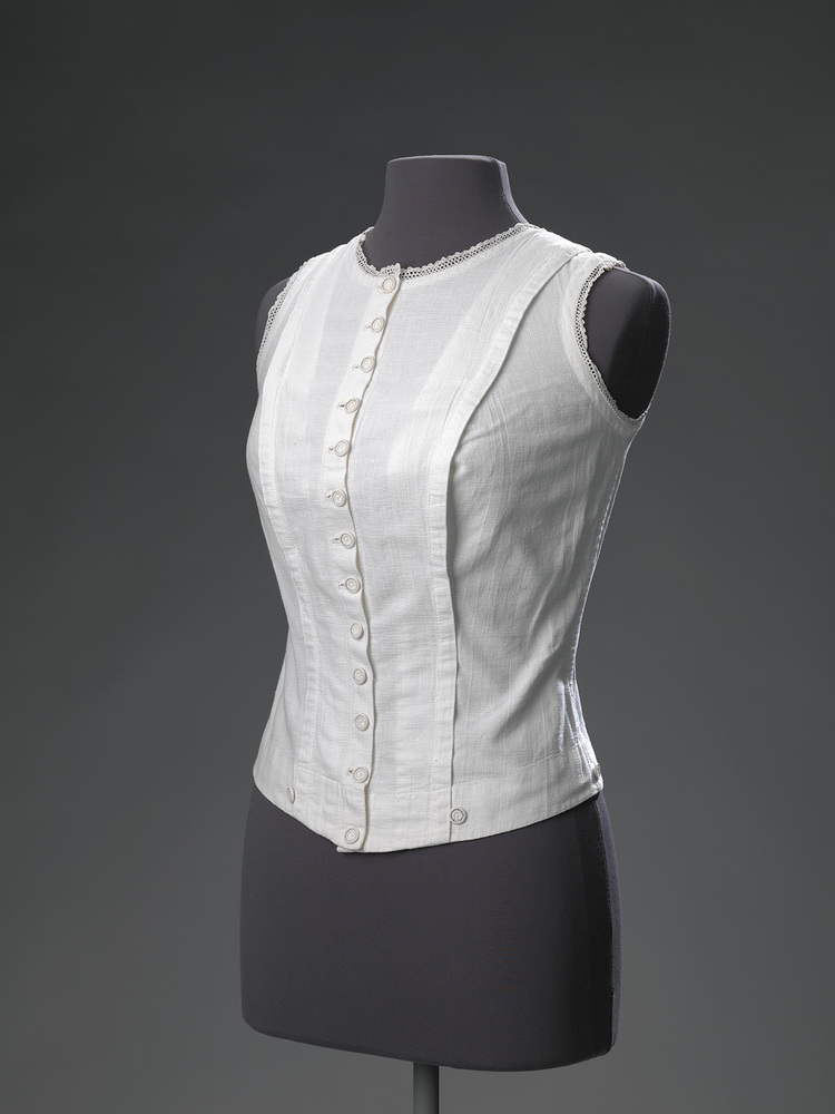 Onderlijfje van wit katoen. Sluitend middenvoor middels knopen. Aan de zoom ook knopen om de onderrok aan te hangen.