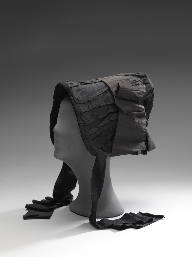 Luifelhoed van zwarte ripszijde enmoirè lint. Mogelijk een reishoed. Zwart leek minder vuil. Geen gebruikelijke modehoed door lange voorkant.
