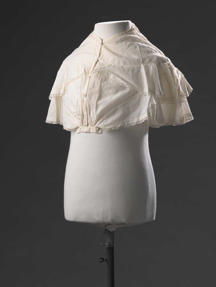 Canezou van wit katoen met splitten in de mouwen. Langs de randen een strook met handgeklost Valenciennes kant. Langs de hals en bovennaad een vulkoord of paspel. Sluiting middenvoor met vier stof overtrokken knopen.