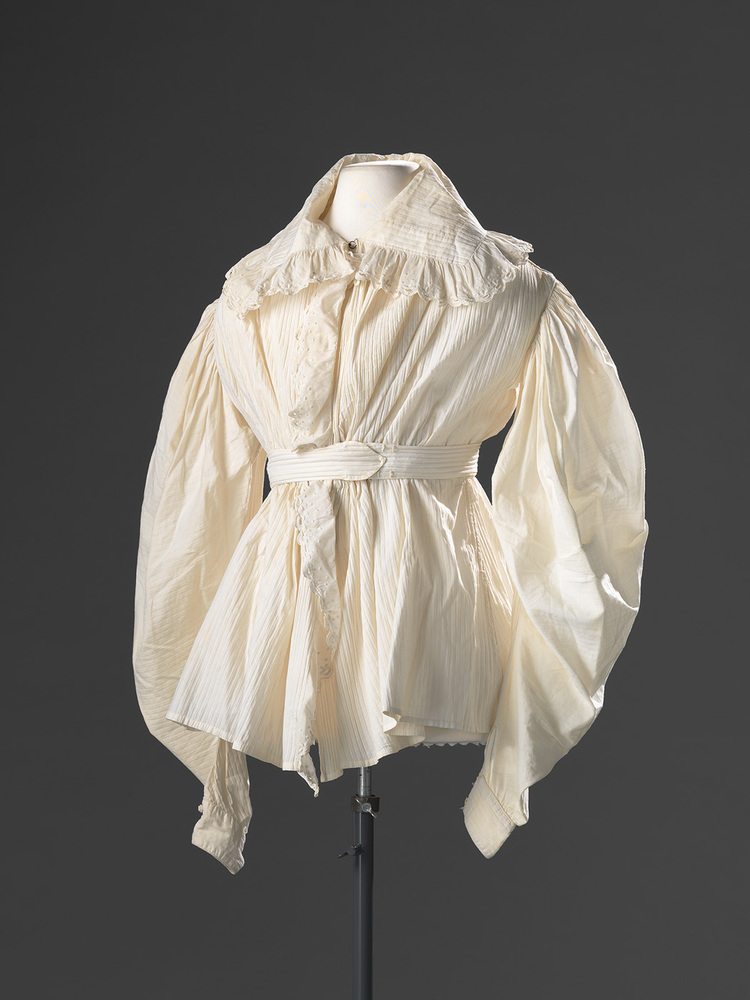 Huisjak of ochtendjak van wit katoen met ingeweven verticale streep. De taille zit hoger dan de natuurlijke taille. De wijdvallende schapenboutmouwen duiden op de periode rond 1830. Het jak is gevoerd om strak te kunnen sluiten, dit werd rond 1830 nog gedaan, maar verdween langzaam.