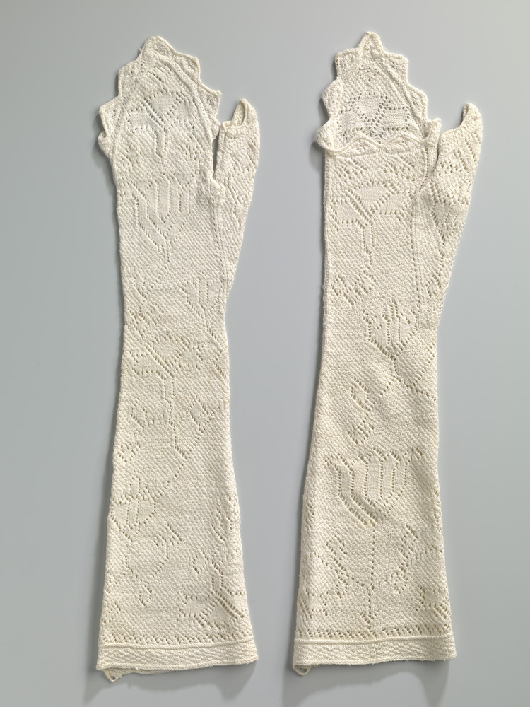 Een paar witte gebreide mitaines van katoen, met open gebreid motief, met punt over de hand. Lusje langs de bovenrand, vermoedelijk om ergens aan vast te maken.- Trefwoorden