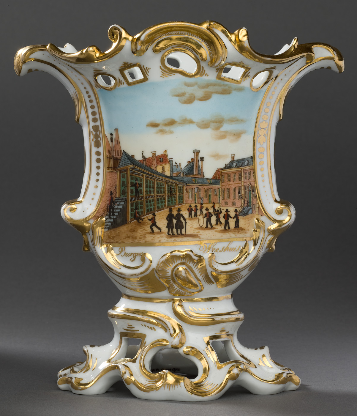 Wit porselein, polychroom beschilderd en verguld. Gewelfde, deels opengewerkte voet, samengesteld uit C en S-vormige voluten in reliëf. Vaasvormig lichaam, de voor- en achterzijde afgeplat, geflankeerd door C en S-vormige voluten in reliëf, deels verguld. Bovenrand geschulpt en deels opengewerkt. De voorzijde polychroom beschilderd met spelende weesjongens op de jongensbinnenplaats van het Burgerweeshuis te Amsterdam.
