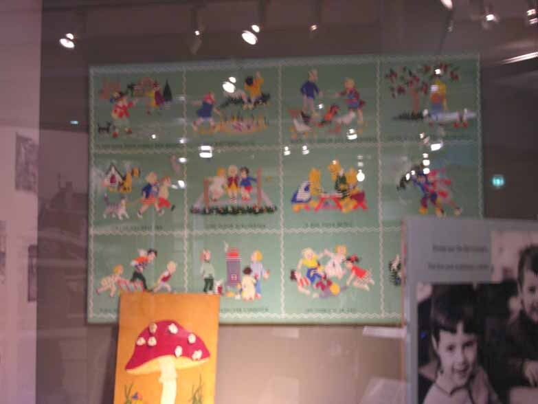 Groen stramien. Door borduurrandje in twaalf vakken verdeeld. In elk vak de eerste regel van een kinderversje met bijbehorende afbeelding: v.l.n.r. 'In Den Haag daar woont een graaf', 'Hansje Knipperdolletje', 'Boer, wat zeg je van mijn kippen', 'Jantje zag eens pruimpjes hangen', 'A, B, C, de kat gaat mee', 'Drie kleine kleutertjes', 'k zag twee beren', 'Onder moeders paraplu', 'Rijen, rijen in een wagentje', 'Sinterklaas Kapoentje', 'Jan Huigen in de ton', 'Slaap kindje, slaap'.