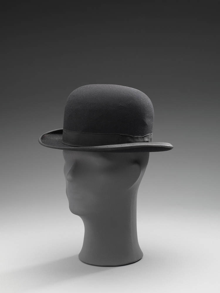 Zwart vilten herenhoed, met band van ripslint, de buitenrand is afgewerkt met hetzelfde band. Binnenband van bruin leer waarin tekst met goudkleurige letters. Boven op de bol een rondje van drie centimeter waarin kleine ventilatiegaatjes geponst zijn.