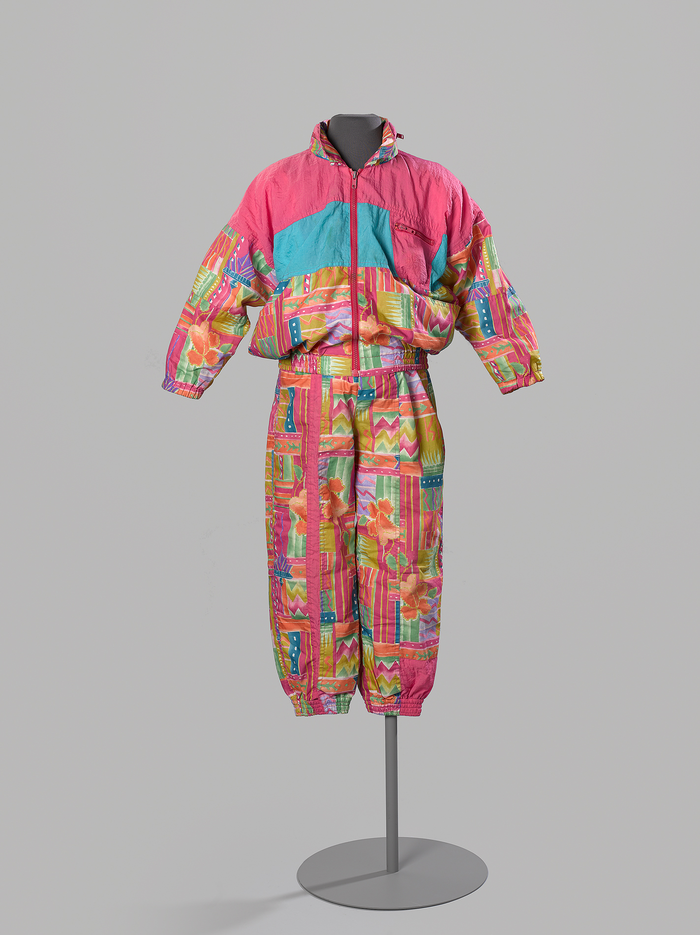 Jack: middenvoor, op linkerzak en in hals een ritssluiting, twee steekzakken. Broek: Elastiek in taille en enkels, steekzakken. Felle kleuren.