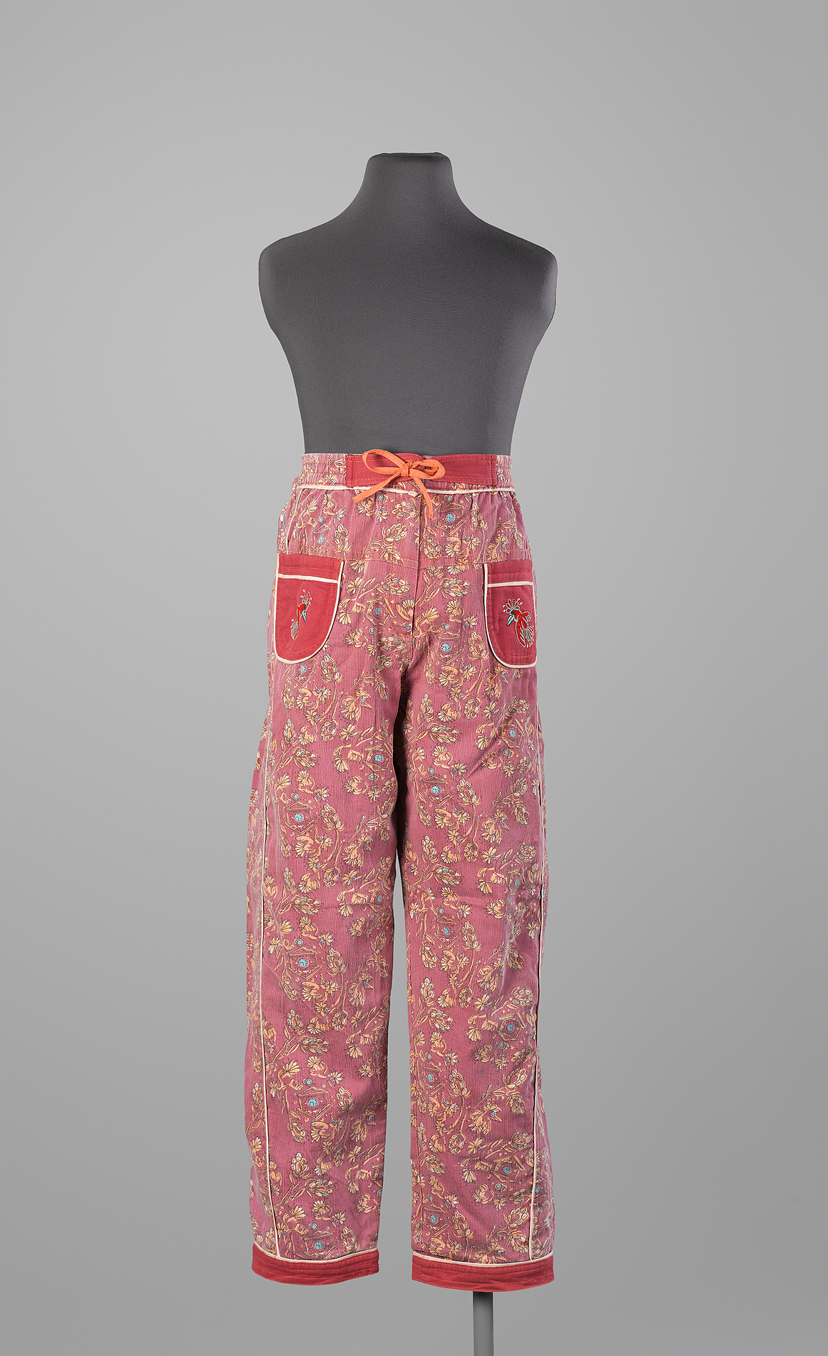 Middenvoor ritssluiting, twee opgestikte zakken waarop een vogel is geborduurd, twee zakken achter. Bruin/rode stof met gele print, afgezet met witte biesjes. Op de band drie fantasiesluitingen met strikjes. Gevoerd met effen, rode, stof.