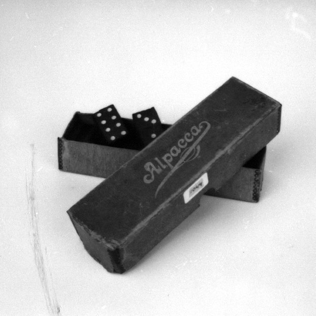 Kartonnen doosje, inhoud 22 dominostenen. Witte stippen op zwarte ondergrond. Het doosje is niet origineel, maar oorspronkelijk een doosje voor messen- Trefwoorden