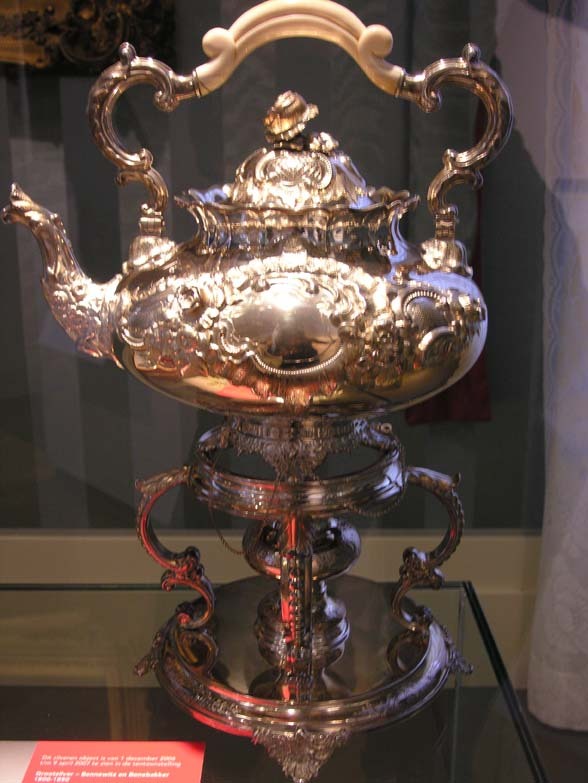 De in neo-rococo stijl uitgevoerde ketel is versierd met rocailles en bloemmotieven. In tegenstelling tot de 18de-eeuwse voorbeelden zijn de ornamenten van de ketel symmetrisch en zwaar uitgevoerd. De ketel en het komfoor zijn scharnierend aan elkaar bevestigd. Hierdoor kon men heet water opschenken zonder de zware ketel op te hoeven tillen.