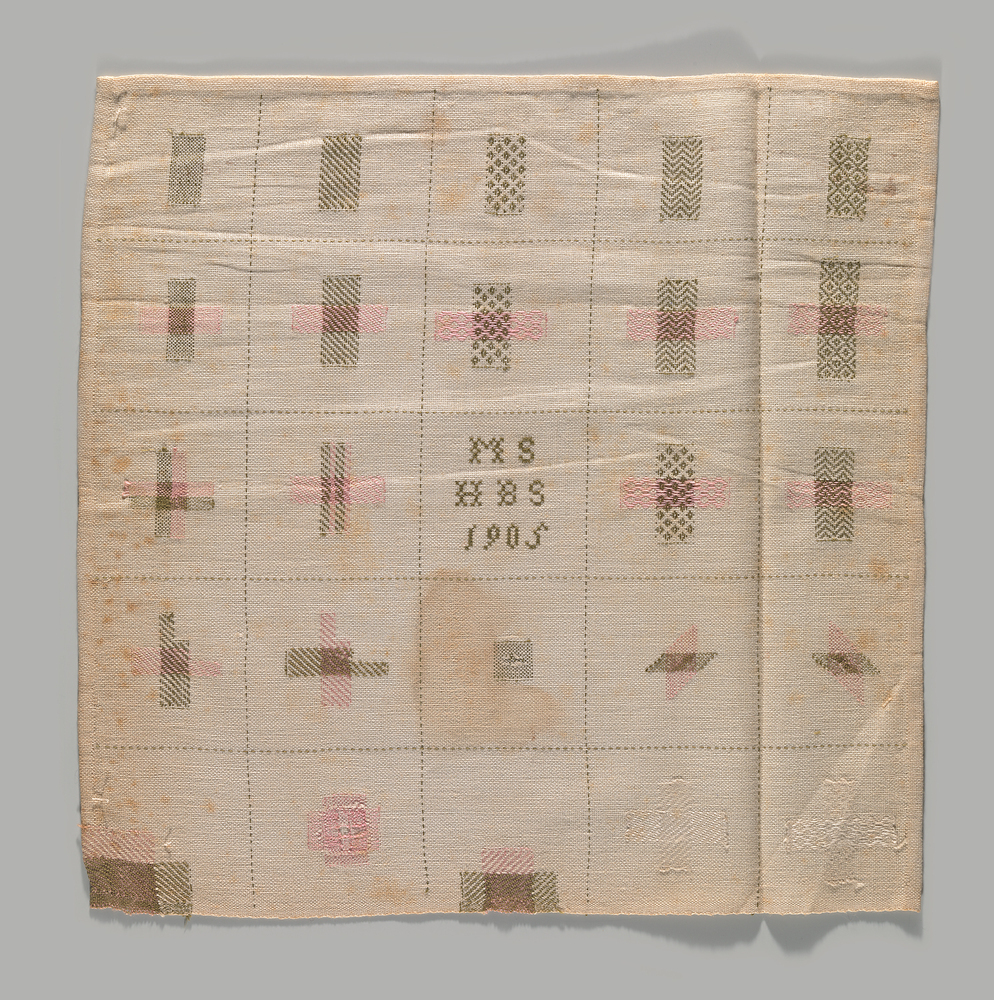 Met stiksteken verdeelde Mien haar stoplap, die 36,5 bij 36,5 cm meet, in 25 gelijke vakken. In het centrum liet ze haar initialen, de naam van haar school en het jaar van de voltooiing van de doek achter. Daaromheen werden 24 stoppen geoefend, uitsluitend kruisstoppen in verschillende variaties. Ze werkte met roze en mosgroen garen op een katoenen ondergrond . De meisjes leerden linnengoed onzichtbaar herstellen. Door gekleurde garens te gebruiken tijdens hun opleiding sprongen foutjes direct in het oog. De laatste twee stoppen aan de onderkant laten zien hoe het uiteindelijk hoort: onzichtbaar.