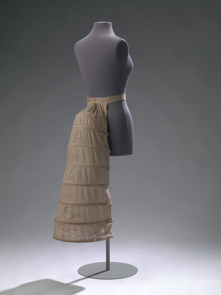 Tournure van bruin/wit gestreepte katoen. De vorm is bepaald door acht, steeds wijder uitlopende metalen banden, in horizontale tunnels genaaid. De gebogen vorm is verkregen door een smalle strook katoen vast te naaien aan de uiteinden, waardoor de voorkant bol gaat staan. Tailleband sluit door middel van een veiligheidsspeld. De zijpanelen zijn bij een eerdere restauratie verwijderd.