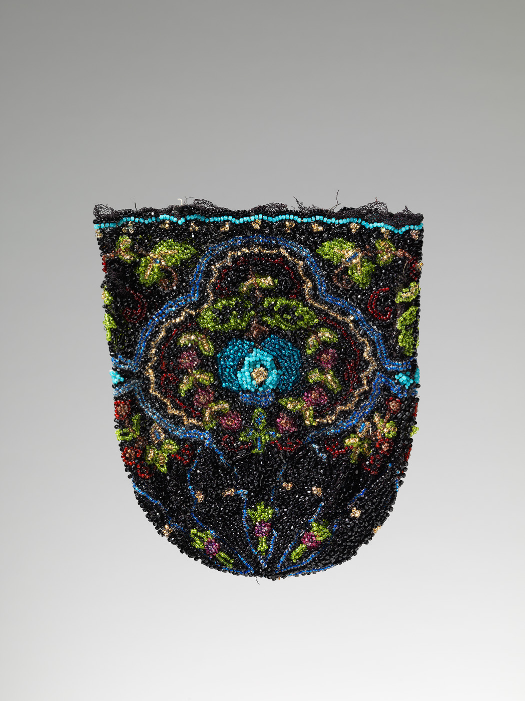 Blauwe, roze en groene kralen in bloem- en bladmotief tegen achtergrond van zwarte kralen. Gezet op een ondergrond van zwarte tule.- Trefwoorden