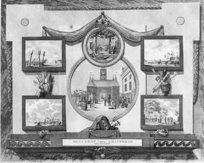 In verschillende taferelen wordt in deze prent herinnerd aan de strijd tussen de patriotten en de Pruisische troepen. Amsterdam werd verdedigd vanuit een kring van vooruitgeschoven posten – de strijd bij enkele van deze schansen is afgebeeld. In het midden de Leidsepoort, waar een Pruisisch garnizoen gelegerd werd na de overgave op 10 oktober 1787.