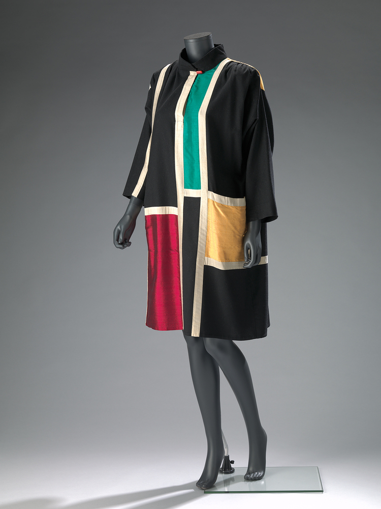Zwartwollen rechte jurk, knielengte, met lange mouwen en opstaand boordje. Voor- en achterpand hebben op onregelmatige afstand blokken en rechthoeken van felgekleurde zijde als tussenzetsels. De tussenzetsels zijn omgeven door banen naturelkleurige zijde. Door het kleurgebruik van de zijde (op het voorpand geel, rood en groen, op de achterzijde rood, blauw en geel) geeft het de indruk van een schilderij van Mondriaan. De sluiting is een hardrode, langwerpige knoop onder het boordje.