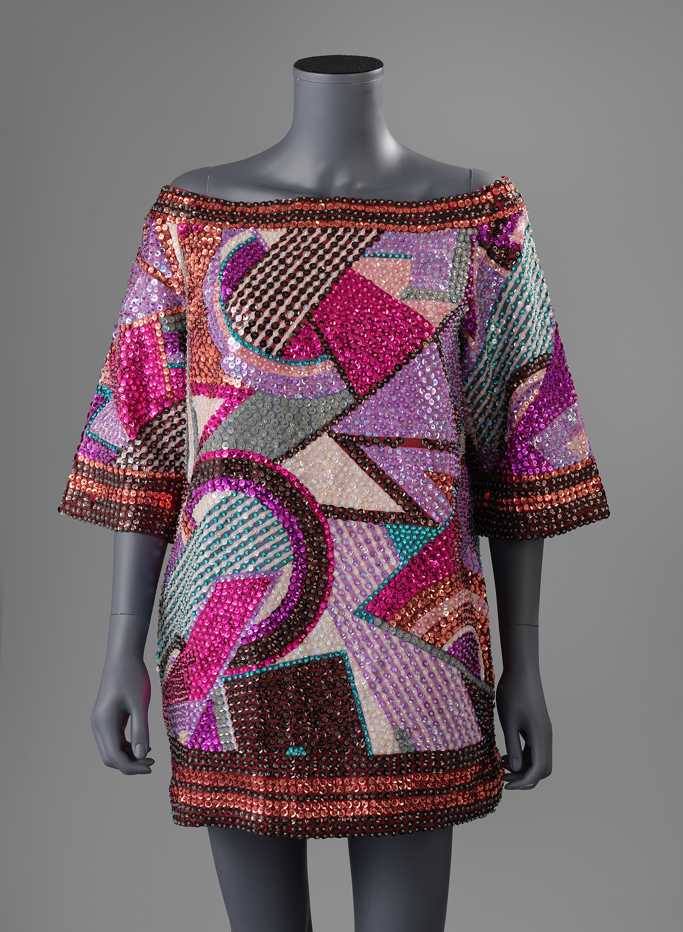 Heuplange hes met boothals en driekwart raglan mouw. Voile met veelkleurig, geometrisch dessin in zeefdruk. Elk vlak is geheel bedekt met handmatig opgenaaide pailletten in kleur van ondergrond. Voering van steenrode voeringzijde.