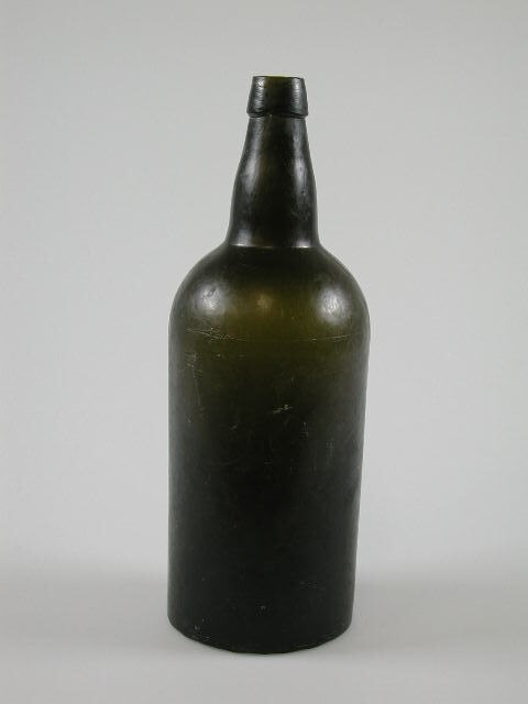 Olijfgroen glas. Dof oppervlak maakt glas vrijwel ondoorzichtig. Ingestoken bodem met op rand P&S RENDORP AMSTERDAM in rondlopende tekst. Cilindrisch lichaam met afgeronde schouder. Conische hals met conische lip.- Trefwoorden