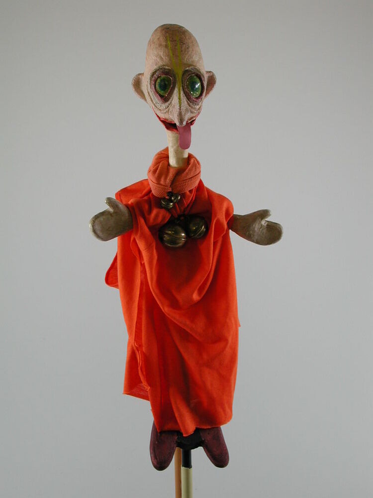 Stokpop van aanhanger van hare krishna-geloof, met kale kop, groene ogen en roze tong uit mond. Jurk van gedrappeerde oranjekleurig tricot, waarop twee koperen bellen hangen.- Trefwoorden