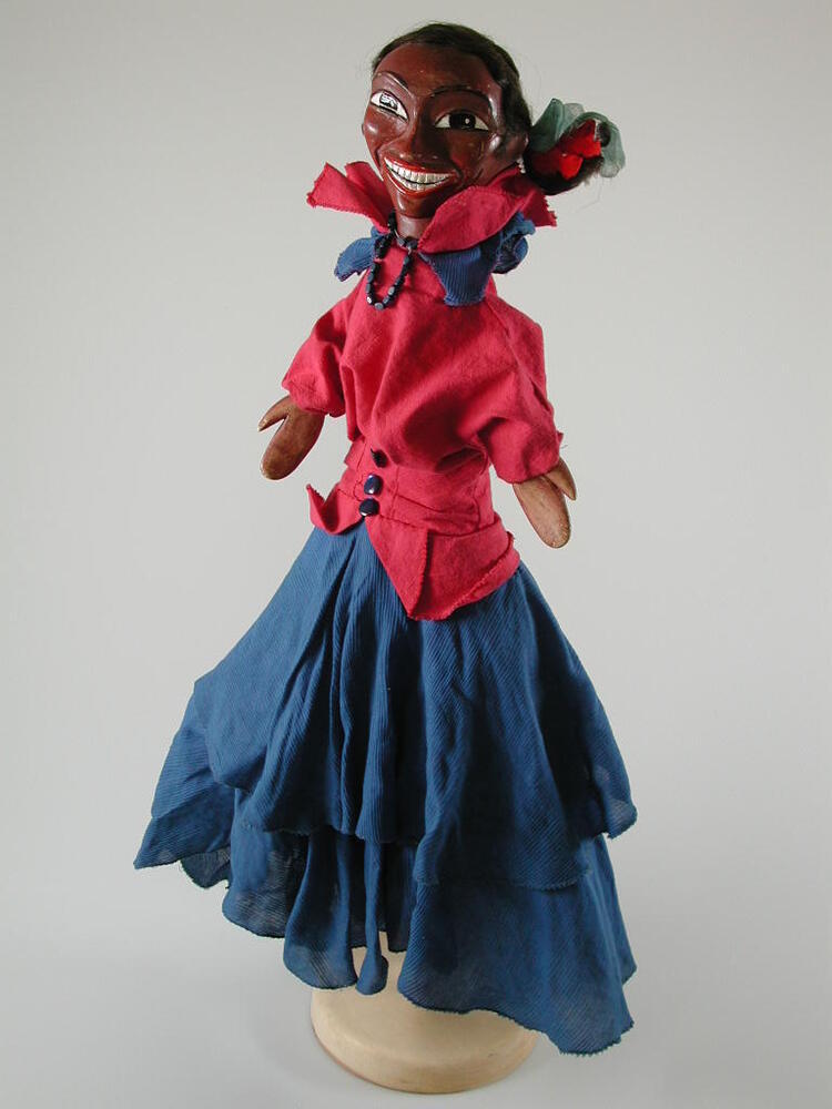 Vrouwelijke pop met lachende, bruine kop. Blouse van cerisekleurige katoen. Dubbele circelrok van blauw katoen.- Trefwoorden