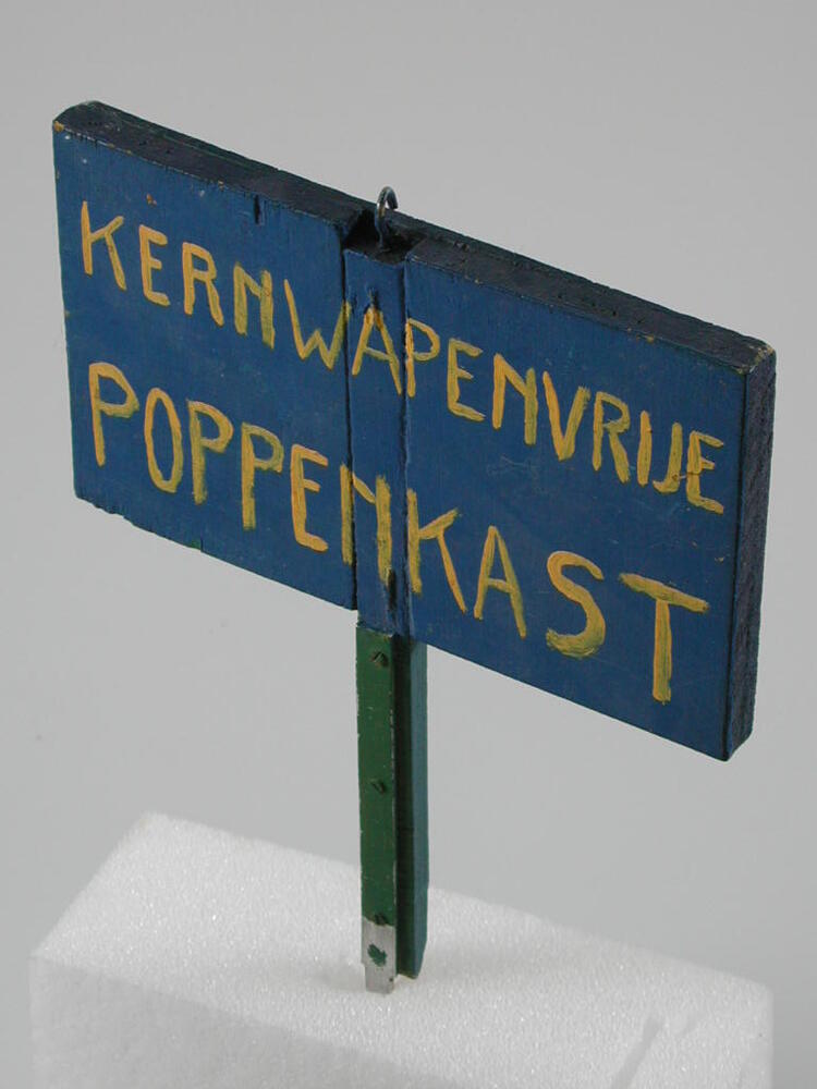 Houten tekstbord, blauw geverfd met in gele letters KERNWAPENVRIJE/POPPENKAST. Op achterzijde in gele letters VERBODEN/TOEGANG.- Trefwoorden