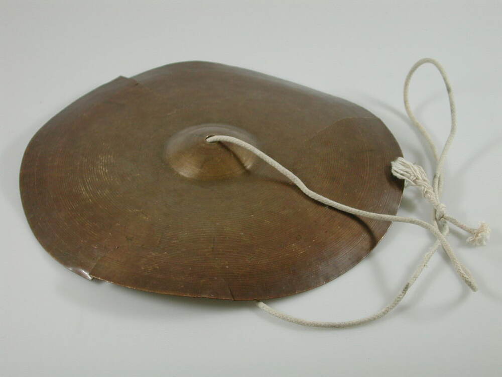 Metalen bekken met diverse scheuren. Touw door gat in midden van bekken.- Trefwoorden