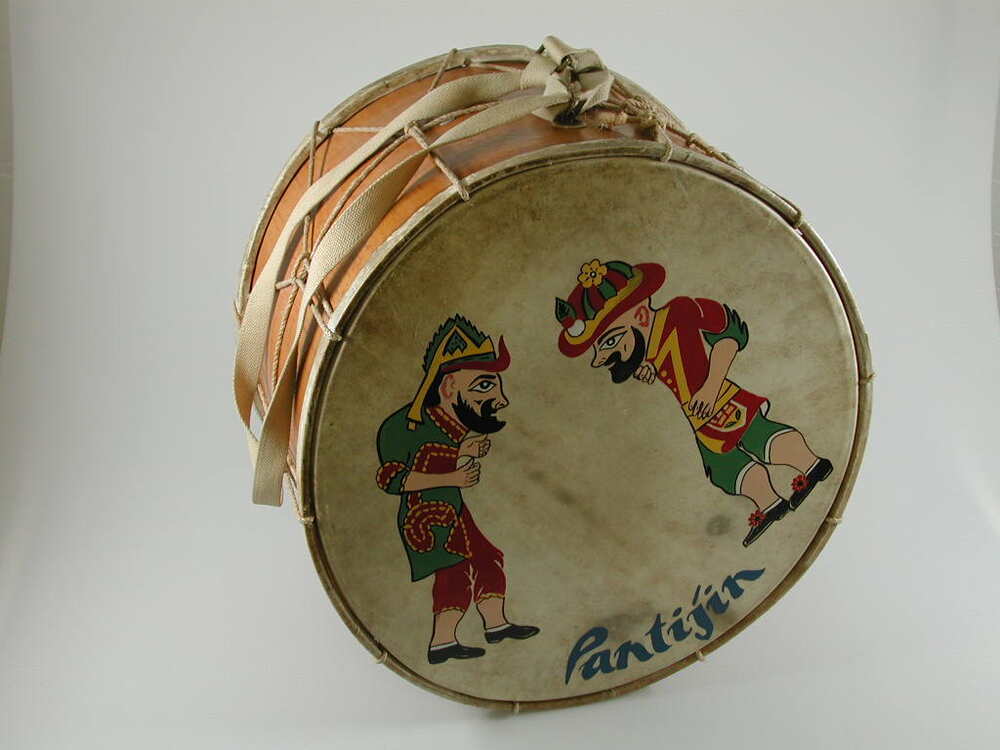 Grote houten trom. Vel aan voor- en achterzijde gespannen met messing ringen en touw. Aan zijkant van trom zijn draagbeugels bevestigd. Door beugels zit linnen draagband. Op vel is schildering van twee Turkse legendarische poppenkastfiguren. Daaronder tekst PANTIJIN (sic).