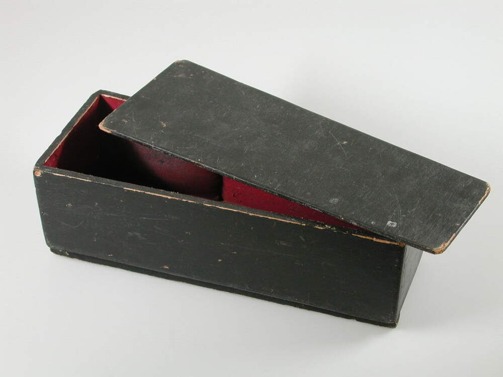 Langwerpige kist met deksel, aan buitenzijde zwart geverfd. Aan binnenzijde rood geverfd, aan beide binnenzijden zit schuimrubber.- Trefwoorden