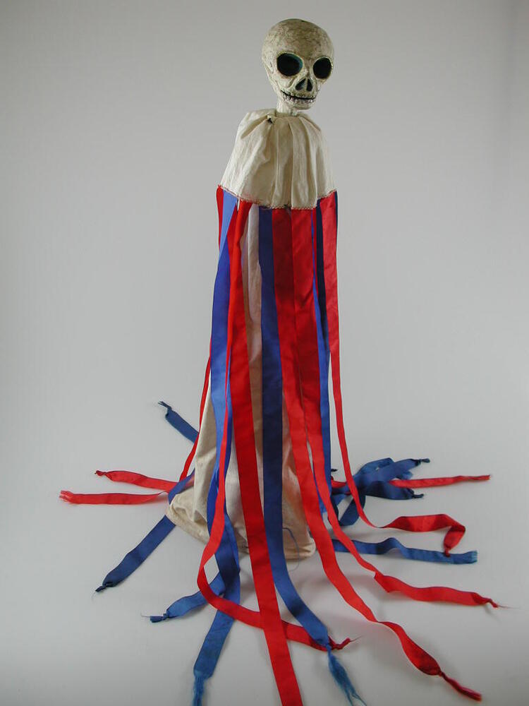 Schedel op stok met witkatoenen geplooid gewaad, waaraan lange rode en blauwe linten afhangen.- Trefwoorden