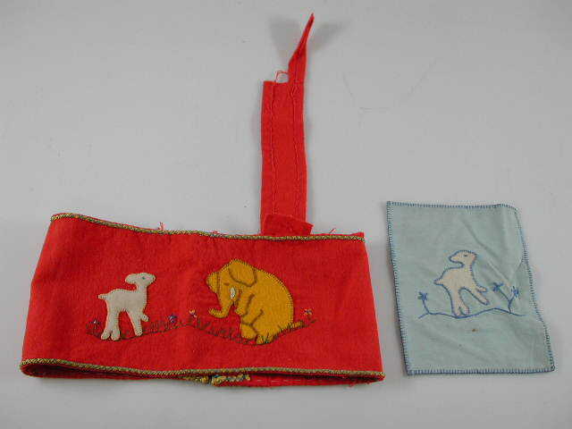 Blauw katoen met in midden, in applicatietechniek, lammetje in wit veld. Afgewerkt met blauw gefestonneerde rand.- Trefwoorden