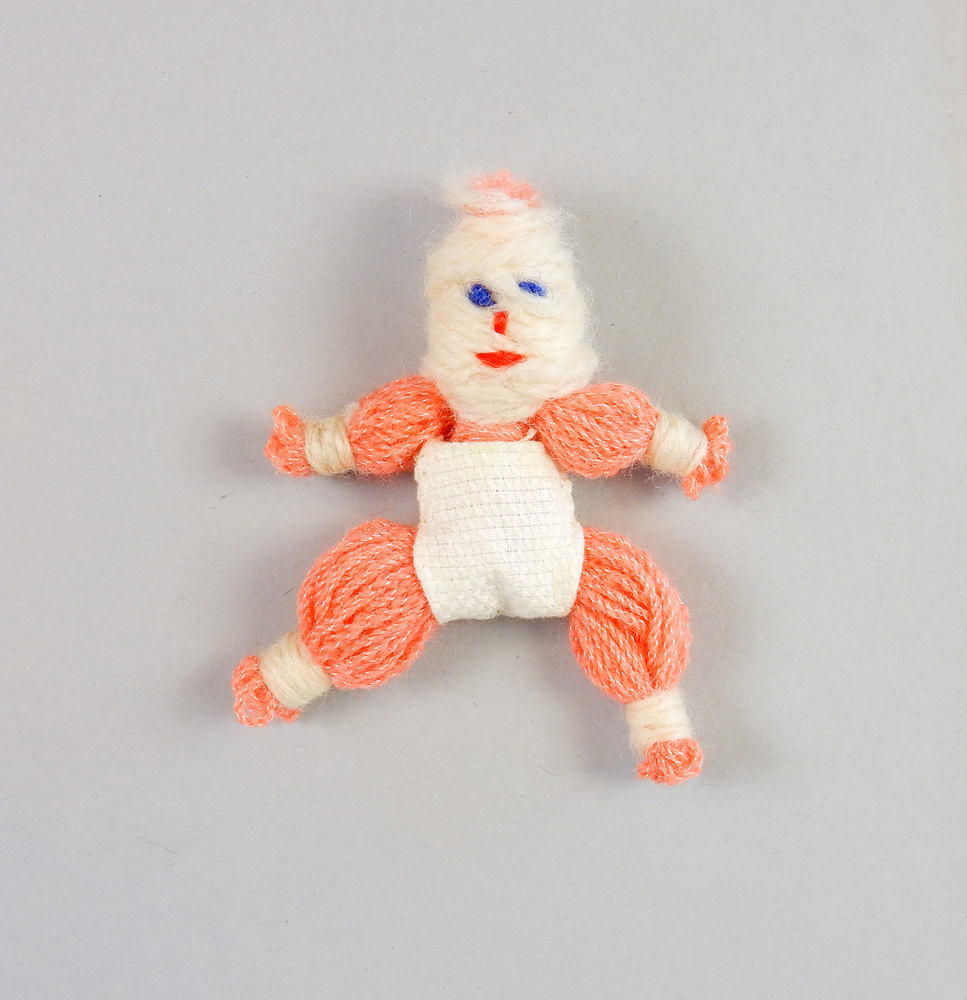 Babypop gemaakt van bundels roze-wite wollen draad. Met katoenen luier.- Trefwoorden