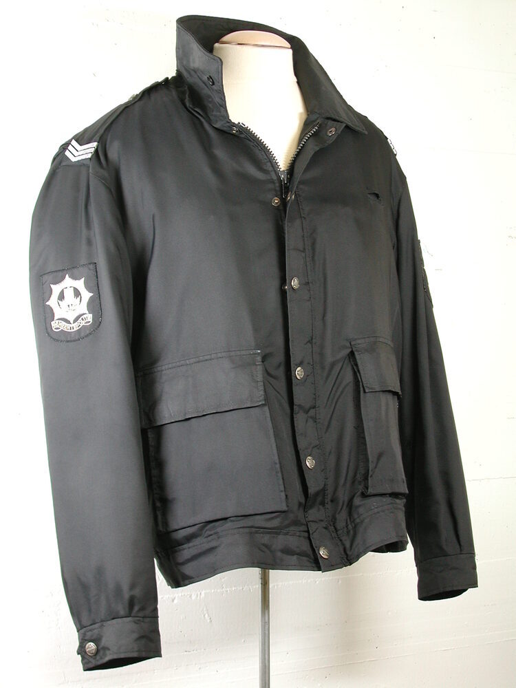Blousonmodel jack van zwarte, ganzende kunststof. Kort model, met lange mouwen, kraag en opgestikte klepzakken. Sluiting door deelbare rits en zes metalen drukknopen met logo. Epauletten met drie metalen strepen (= rang hoofdagent, voor 1 april 1994). Op beide mouwen opgestikt katoenen badge met, in wit, het logo en daaronder tekst Gemeente politie. Uitritsbare voering van donkerblauwe wol met gewatteerde mouwen. Hierbij wordt paardrijbroek (KA 20716) gedragen.